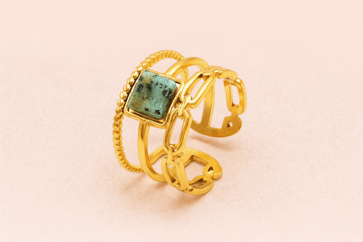 Elevate your accessory collection with the African Stone Triple Layer Open Ring – Adjustable 18K Gold Plated Stainless Steel. Designed with a striking three-layer structure, this ring blends modern elegance with the earthy beauty of African natural stone, creating a bold and unique statement piece.