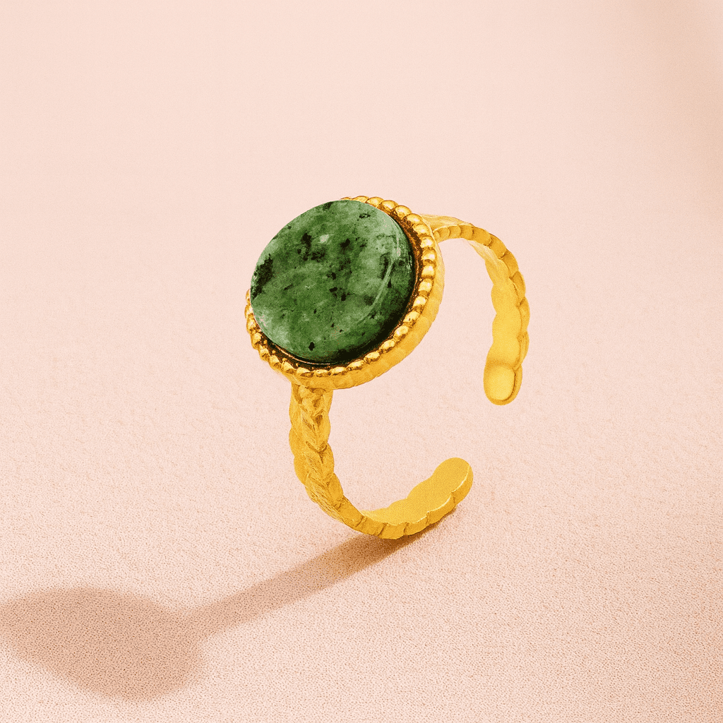 The unique circular crown setting highlights the stone’s natural texture, giving this piece a modern yet organic feel. Whether styled alone or stacked with your favourite rings, it adds effortless bohemian elegance to any outfit.