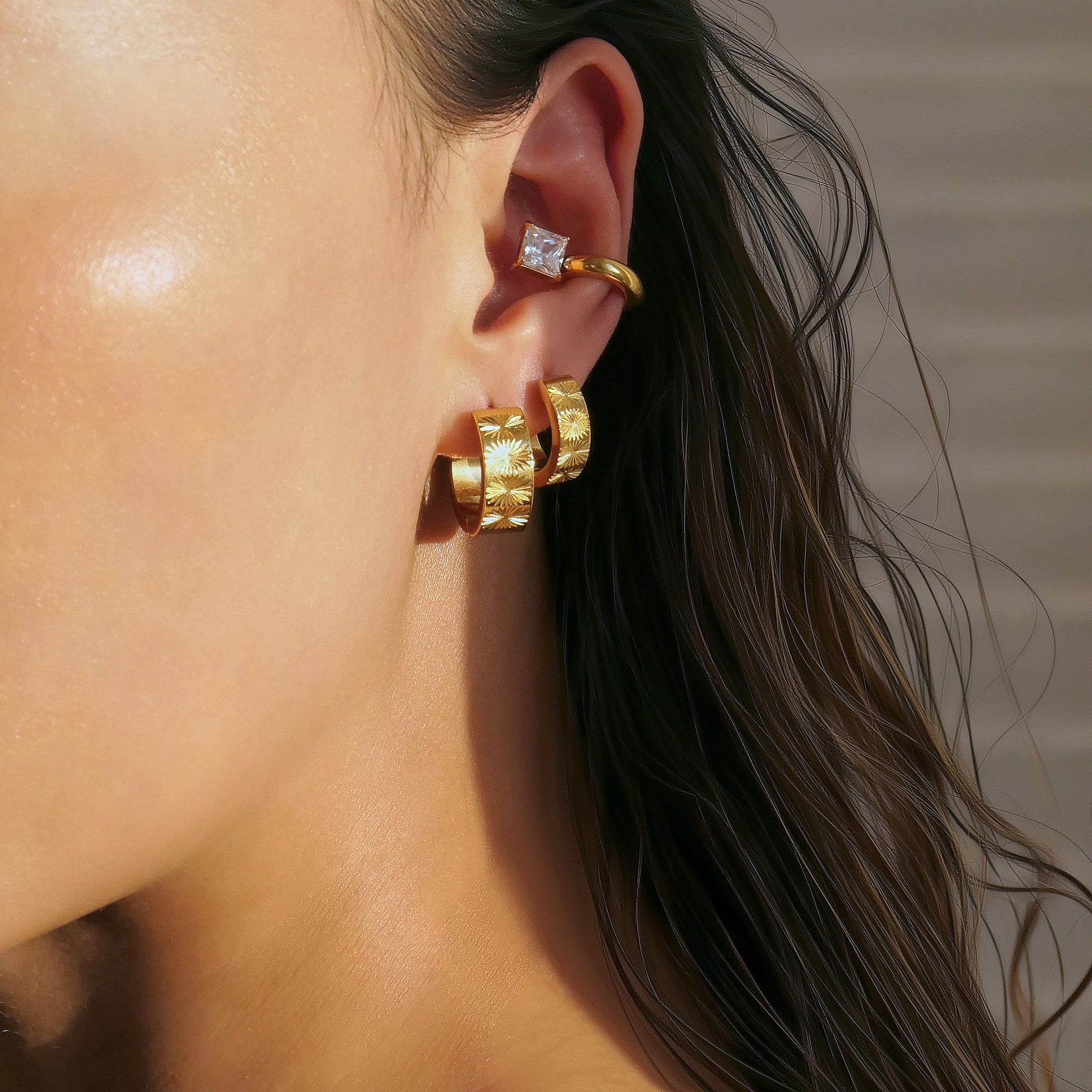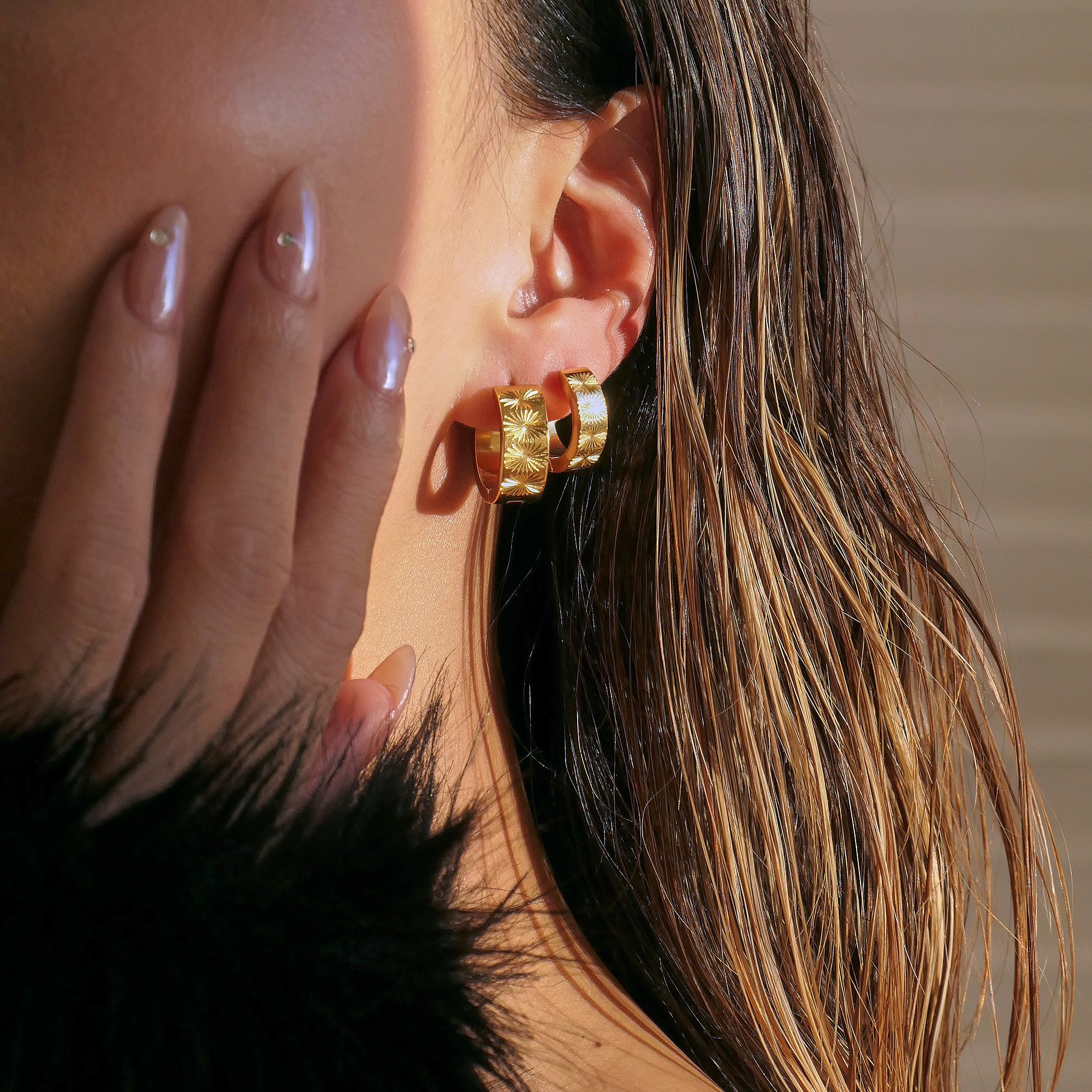 Shine bright with our Sun Embossed Hoop Earrings, designed to bring warmth and style to any outfit. Each hoop showcases a beautifully laser-cut sun pattern, adding a subtle statement to your jewellery collection.